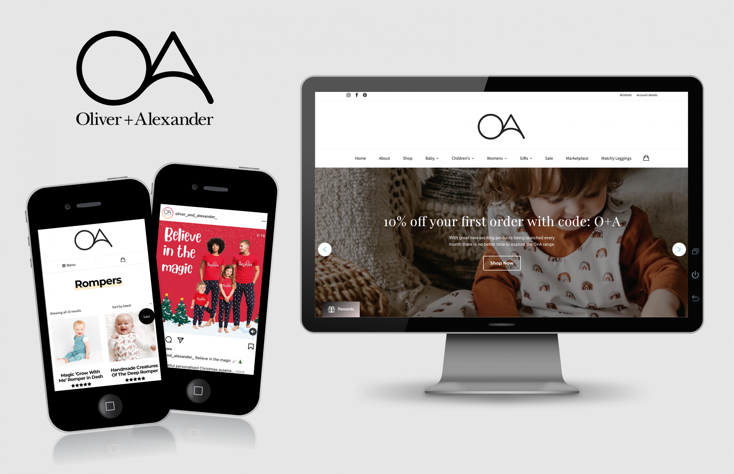 We anchored the entire visual system around clean lines, minimal palettes, and a high-end boutique aesthetic. The branding needed to feel sharp enough for fashion-forward parents, yet soft enough to honour the handmade ethos at the heart of O+A.